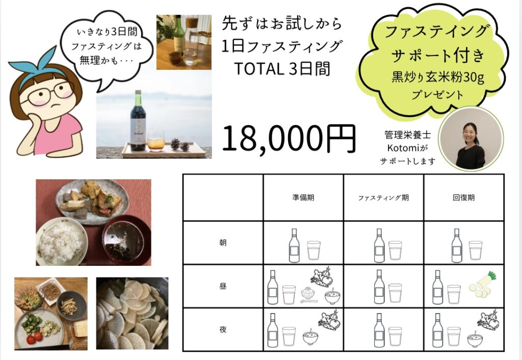 3日は無理かも〜という方には1日ファスティングコース(合計3日間)もしっかりサポート付きでご用意しています。スタッフと一緒にみんな初めてでしたがみんなクリア!1.5キロ程度減って、何よりも便秘が解消されたり、食に対しての見直しができたと喜んでいます。