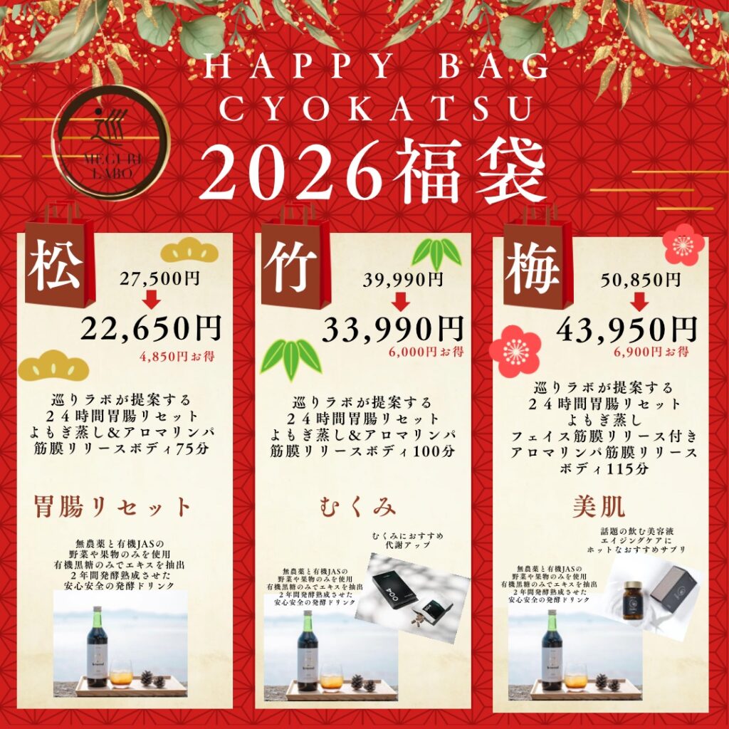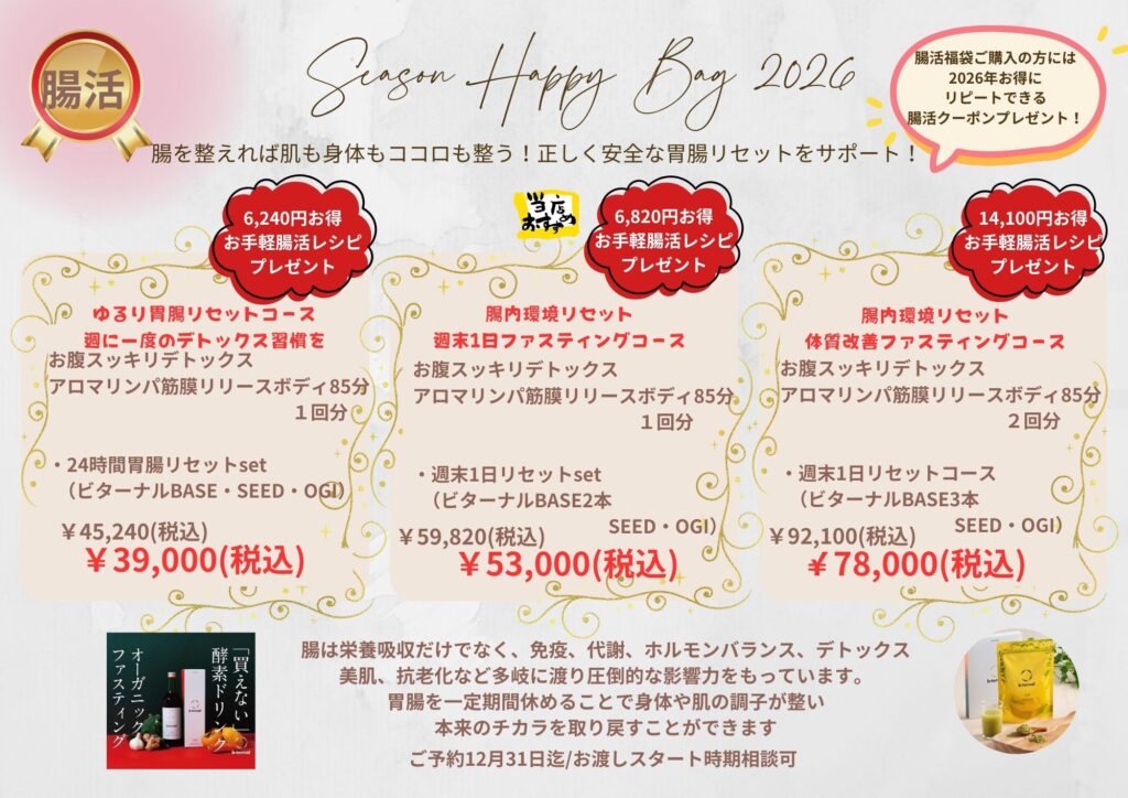 12月31日まで腸活福袋のご予約を承っています。施術もついてお得で、いいきっかけになりますよ。公式LINEからご予約を受け付けています。