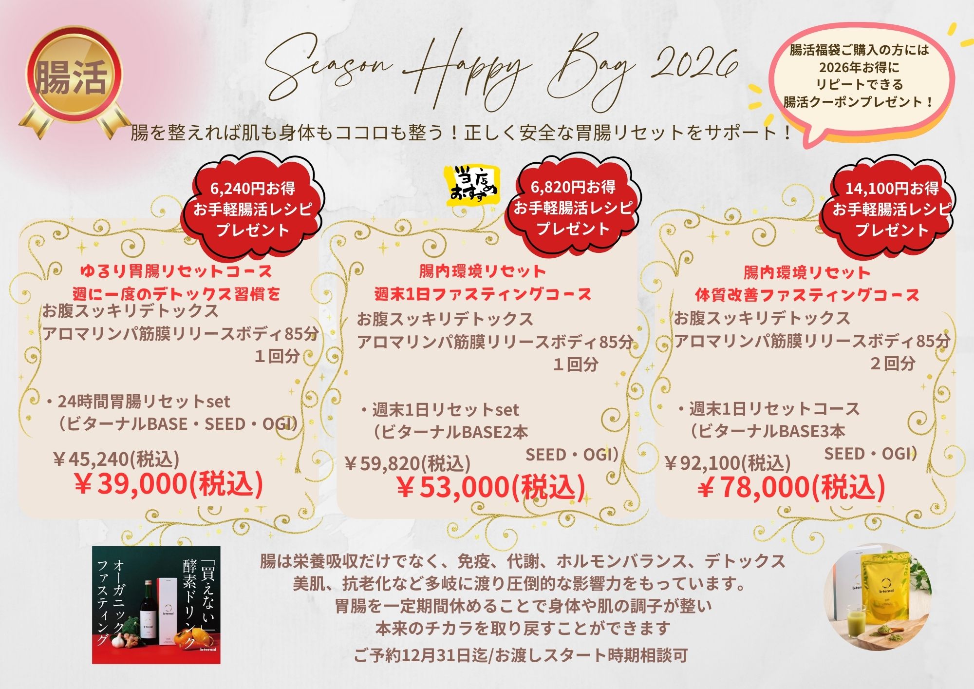 お客様の中で年始から腸活ファスティングをチャレンジする方がいらっしゃいます。福袋の腸活セットを年内に予約して、新年開けてひと段落したらプチファスティングをしてみませんか?