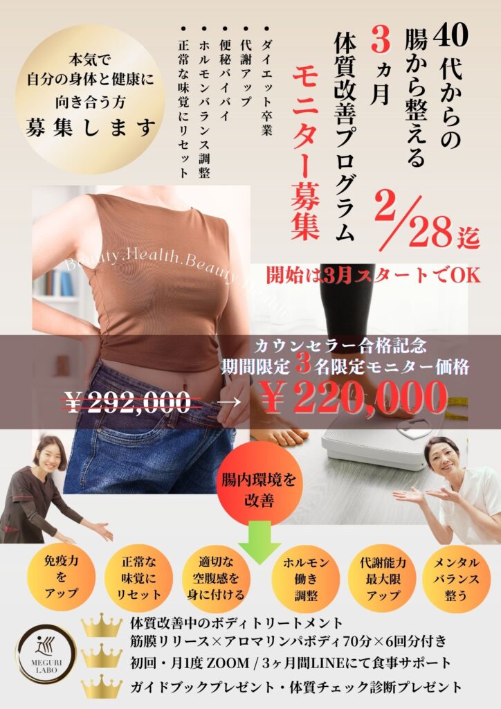 「40代からの腸から整える3ヵ月体質改善プログラムモニター募集」のお知らせです。