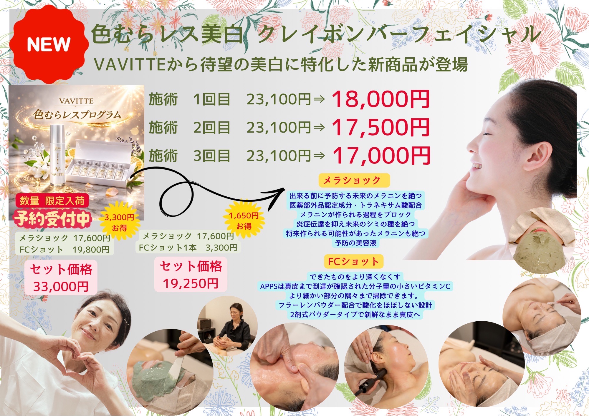 色むらレス美白クレイボンバーフェイシャルが数量限定で新登場です。FCショットを半量使ってお顔全体の美白コースになります。